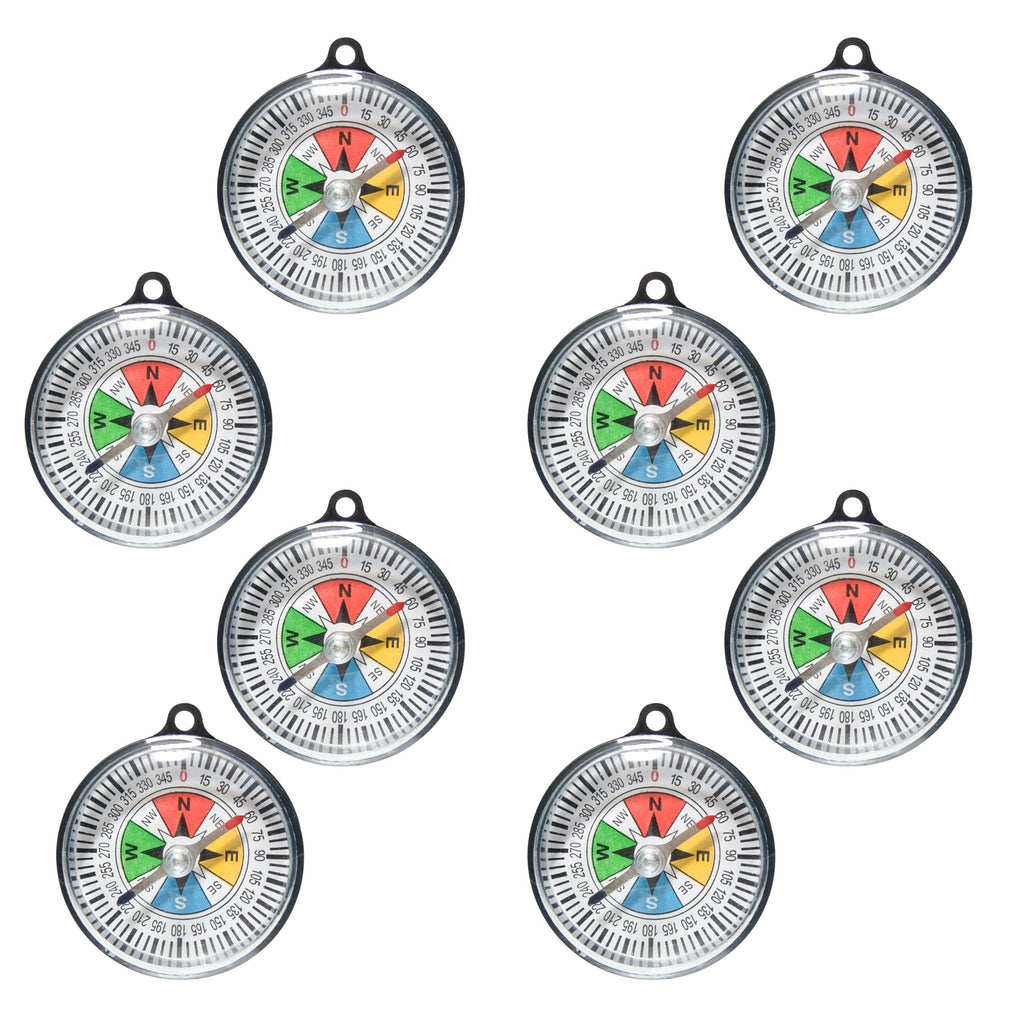 The body of the compass is 55mm diameter. The poles are brightly color coded and the compass is marked every 5 degrees and a hole is provided at the top for a lanyard. Sold as a pack of 8.