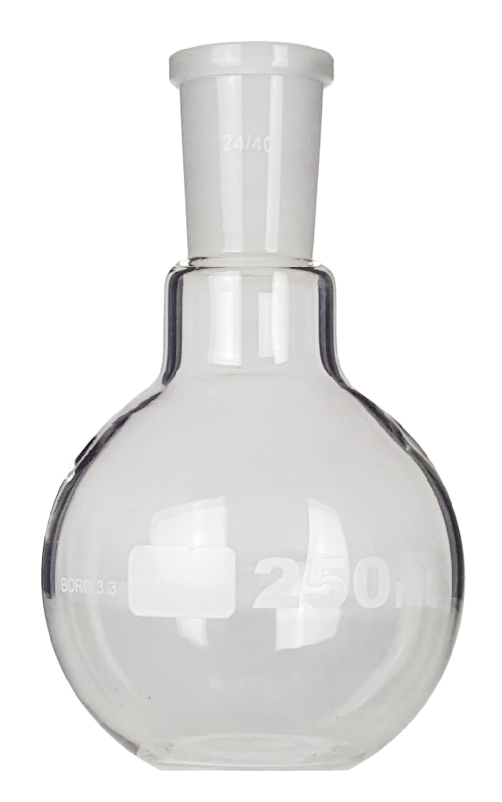 The Boiling Flask has a 24/40 ground joint at the top of the flask. It is made with a uniform wall thickness and flat bottom. The flask is labeled as 250ml and it has a white marking spot. The flask is made from Borosilicate glass which is resistant to breakage due to thermal shock from temperature changes.