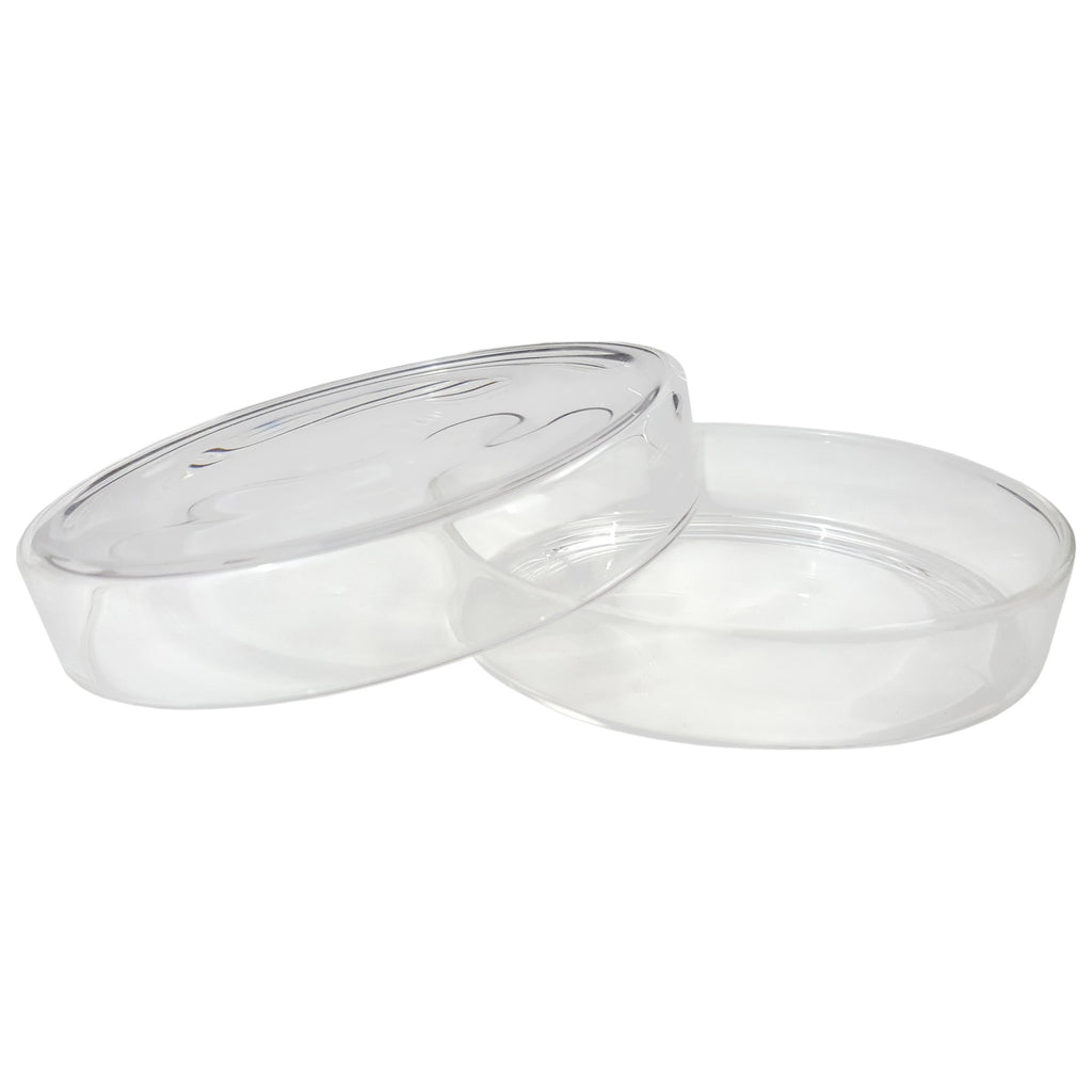 This flint glass Petri dish has two pieces, a lid and bottom dish, which are in 100mm diameter by 15mm height. They are made from flint glass, also known as soda lime glass, and the product is not autoclavable.