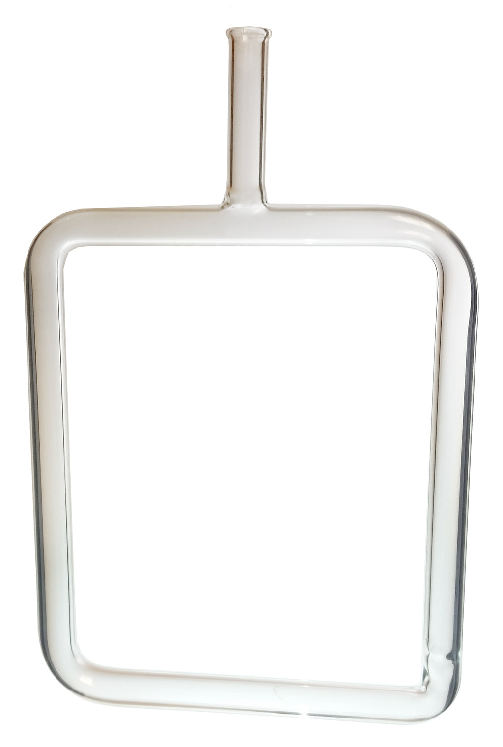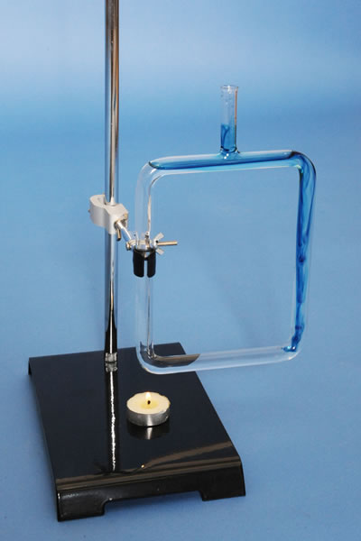 This glass square helps to illustrate a convection current in a liquid. To observe this current, fill the frame with water and dye and heat it at the bottom corner with a heat source. Convection currents are then seen as the dye is moved through the glass tube, similar to the circulation of a hot water system. Heat source and support stand are not included.