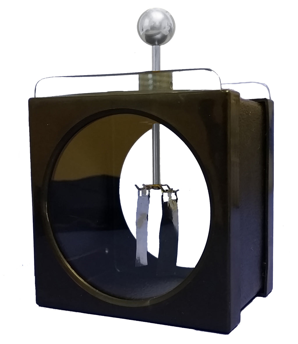 Electroscopes are used to detect and roughly measure the electric charge on an item. This aluminum-leaf electroscope has a metal case with a round viewing window. This is a sturdy electroscope with two glass windows so it can be viewed on both sides. The aluminum leaves have holes on the top that are placed over the hooks inside the electroscope. This make replacing the foil much easier than with traditional electroscopes.