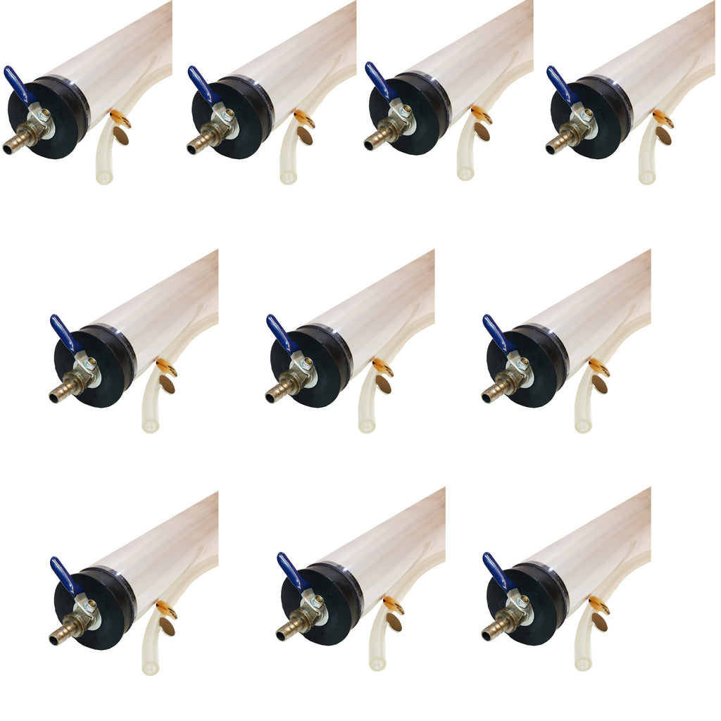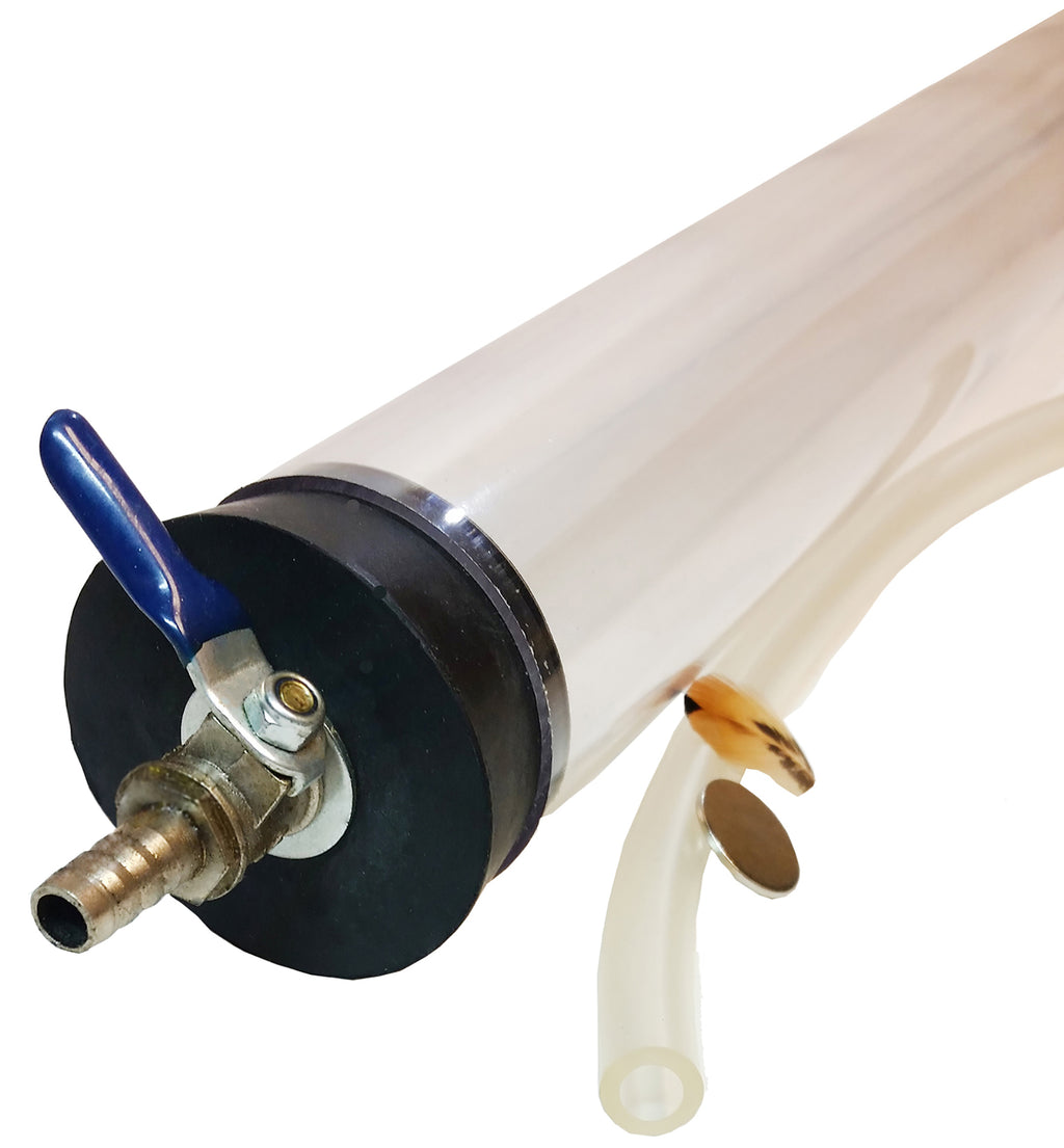 This experiment demonstrates the fact that objects of different masses fall at the same rate in a vacuum. The plastic cylinder has rubber stopper closures on both ends, with one end having a hose connection that is used to evacuate air. When air in the tube is pumped out via a vacuum pump (not included), the coin and feather included with the kit will fall simultaneously because there is nothing causing resistance anymore in the tube.