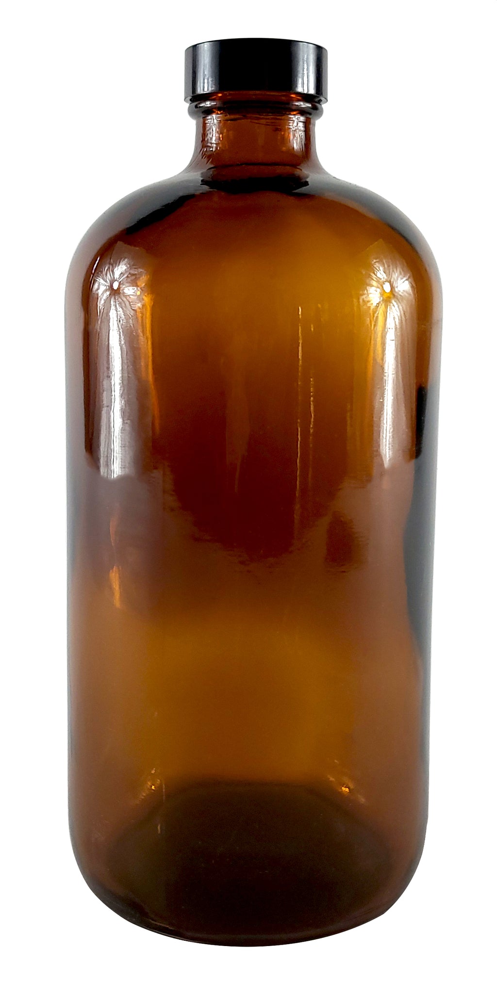 The 32 ounce bottle, amber glass, with cap is useful in many applications. The neck size is 33/405 and sold as a pack of 12.