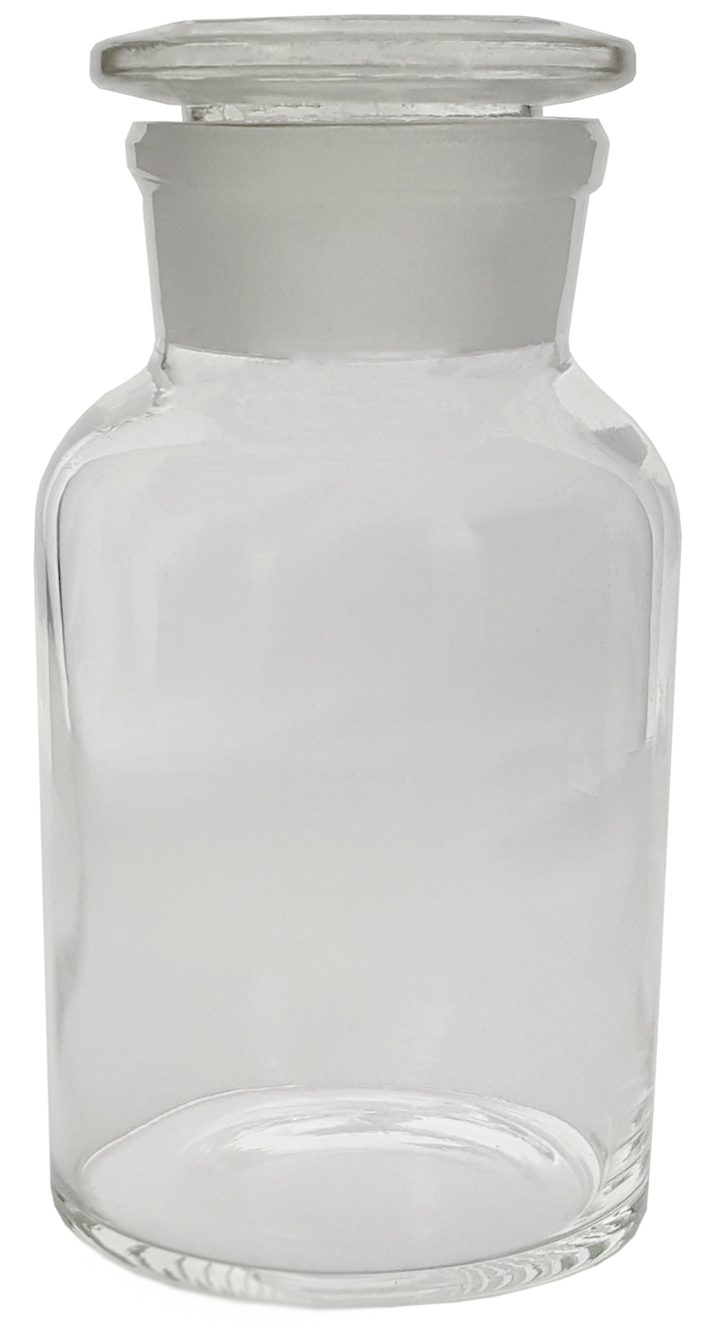 This wide mouth flint glass reagent bottle has a capacity of 250ml and comes with a ground glass stopper.
