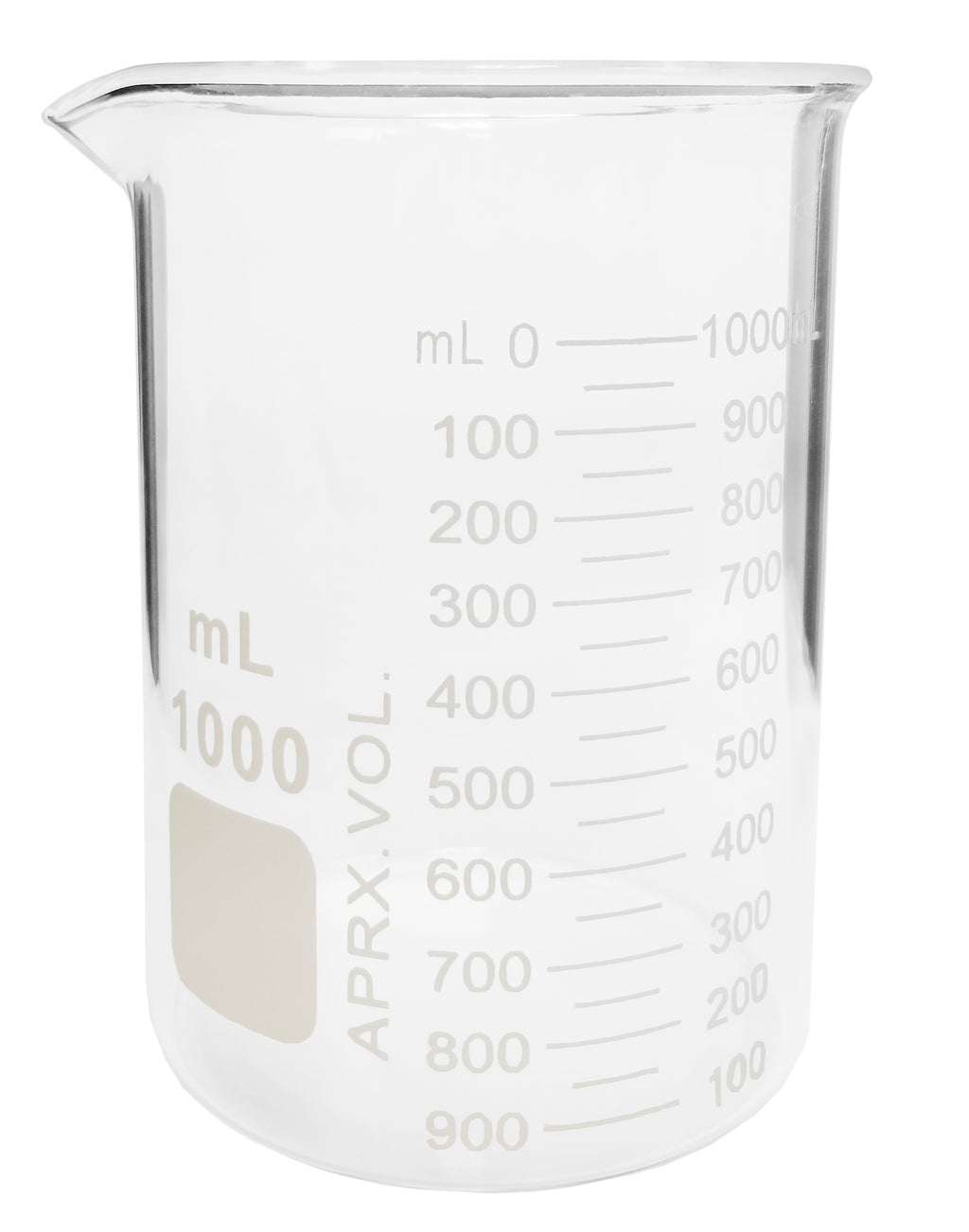 The Griffin Beakers are made from quality, borosilicate glass, which is resistant to strain and breakage due to temperature changes. The beakers have a reinforced rolled rim and even wall thickness. They are graduated with a dual scale and have a white marking spot. The beaker has a capacity of 1000 milliliters.