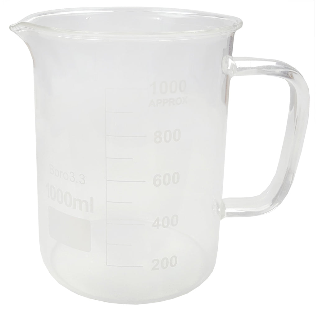 GSC International BKMG1000-PS-CS Beaker Mug, 1000ml with Handle & Pour Spout, Case of 24 – Borosilicate Glass Mugs with Graduations & Rolled Rim