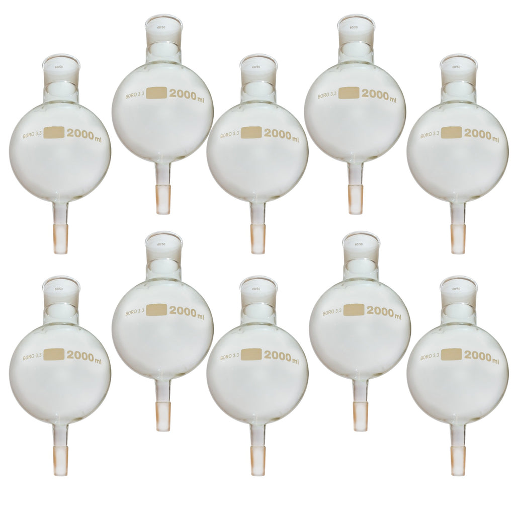 These quality borosilicate glass Biomass Flasks have a 2000ml capacity, a 24/40 ground glass bottom joint, and a 60/50 ground glass top joint. The large top openings are ideal for inserting materials for distillation. Sold in a case of 10
