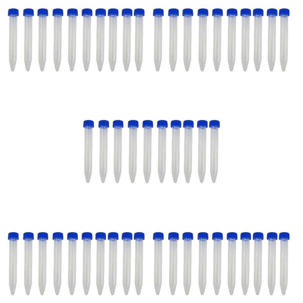 Centrifuge tubes are used to hold various liquid mixtures or liquids containing suspended solids so that they can be spun and separated in a centrifuge. The tubes are made of polypropylene, with white graduations, a frosted marking spot, conical bottom, and screw thread cap. The capacity is 15ml and they are graduated from 2ml to 15ml. Sold in a pack of 50.