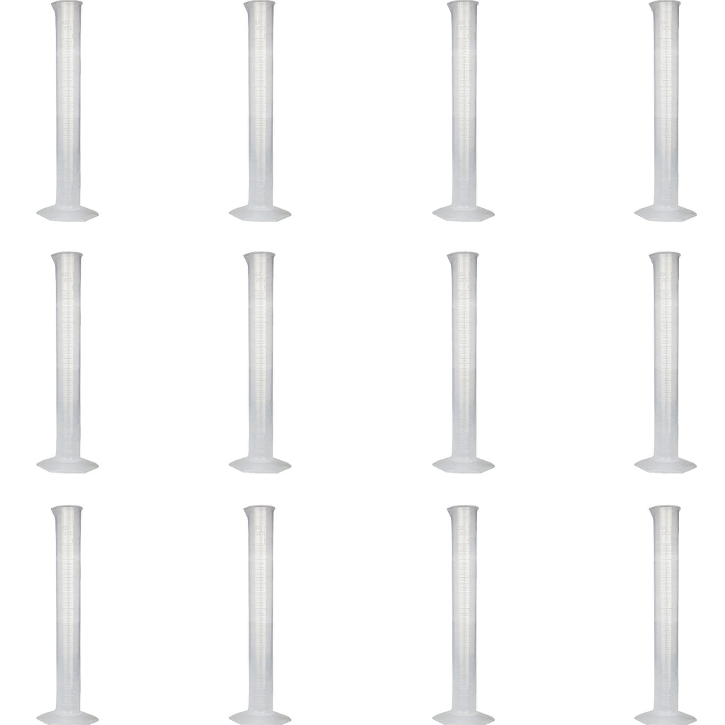 These cylinders are molded from tough, translucent polypropylene plastic, and have raised graduations and a hex base for stability. They are autoclavable up to 120°C. These cylinders have a capacity of 100ml. Sold in a pack of 12.