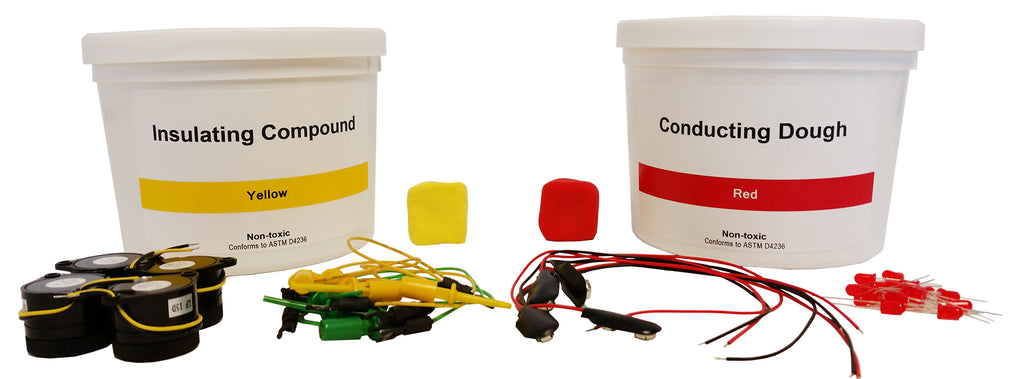 Electra Dough Kits allows students to play with materials that are fun and familiar, all while learning the basic concepts of electrical circuits. Our Electra Dough kits includes everything you need to build both an open or closed circuits and parallel or series circuits. You will light LEDs, sound buzzers, and more with the circuits you build. This classroom kit contains enough supplies to perform up to four experiments simultaneously. Instructions are included, all electrical parts are RoHS compliant, and doughs conform to ASTM D4236 standards.
