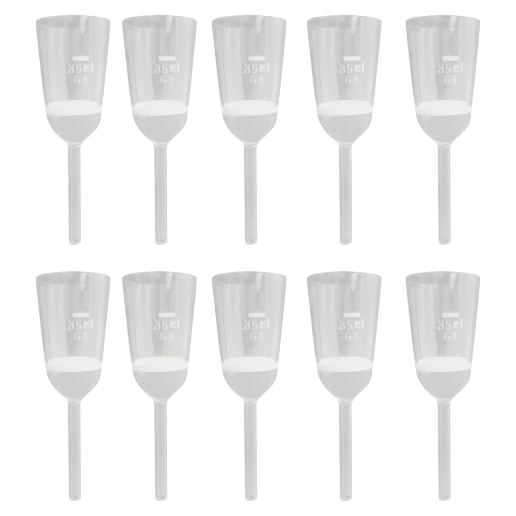 These borosilicate glass Sintered Funnels have a porous filtering plate to filter small particles from any solution poured through it. This funnel has a 35ml capacity and a porosity of 3.