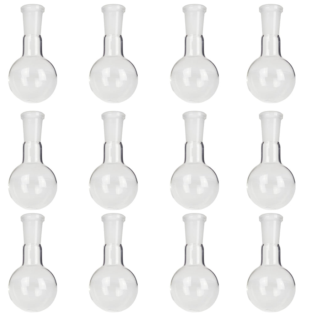 This quality round bottom boiling flask is made from borosilicate glass, and is heat resistant. It has a narrow mouth, a 24/40 ground glass top joint, thick walls, and a capacity of 125ml.
