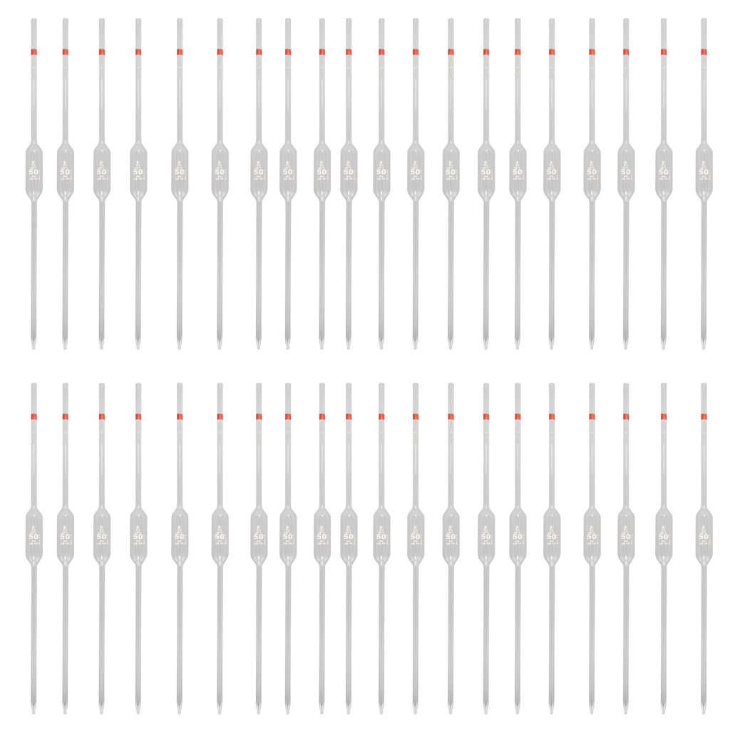 Volumetric pipettes allow for an extremely accurate measurement of a solution. This class B borosilicate glass Volumetric Pipette has a 50ml capacity, a color-coded band, and an amber marking designating the capacity.