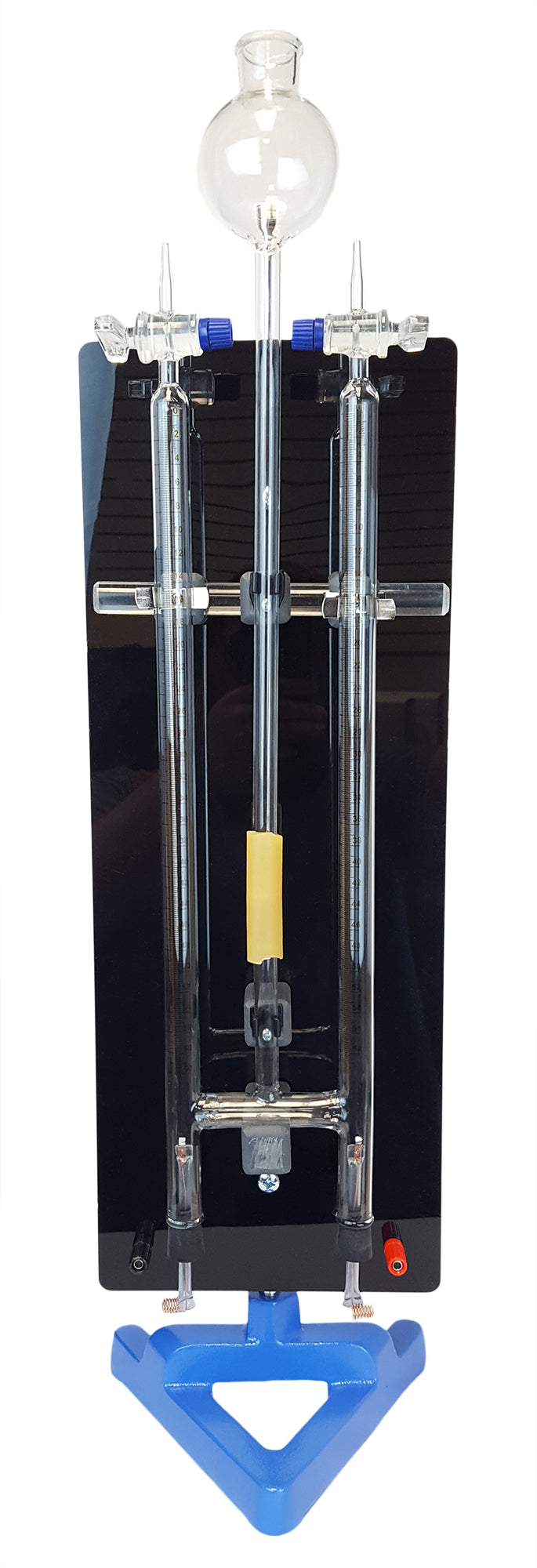 An H-shaped piece of glass with two graduated tubes (up to 60ml at intervals of 0.2ml) on either side is attached to a central funnel. The tops of the H-glass are sealed with ground-glass stopcocks, and the bottoms are capped with platinum electrodes.