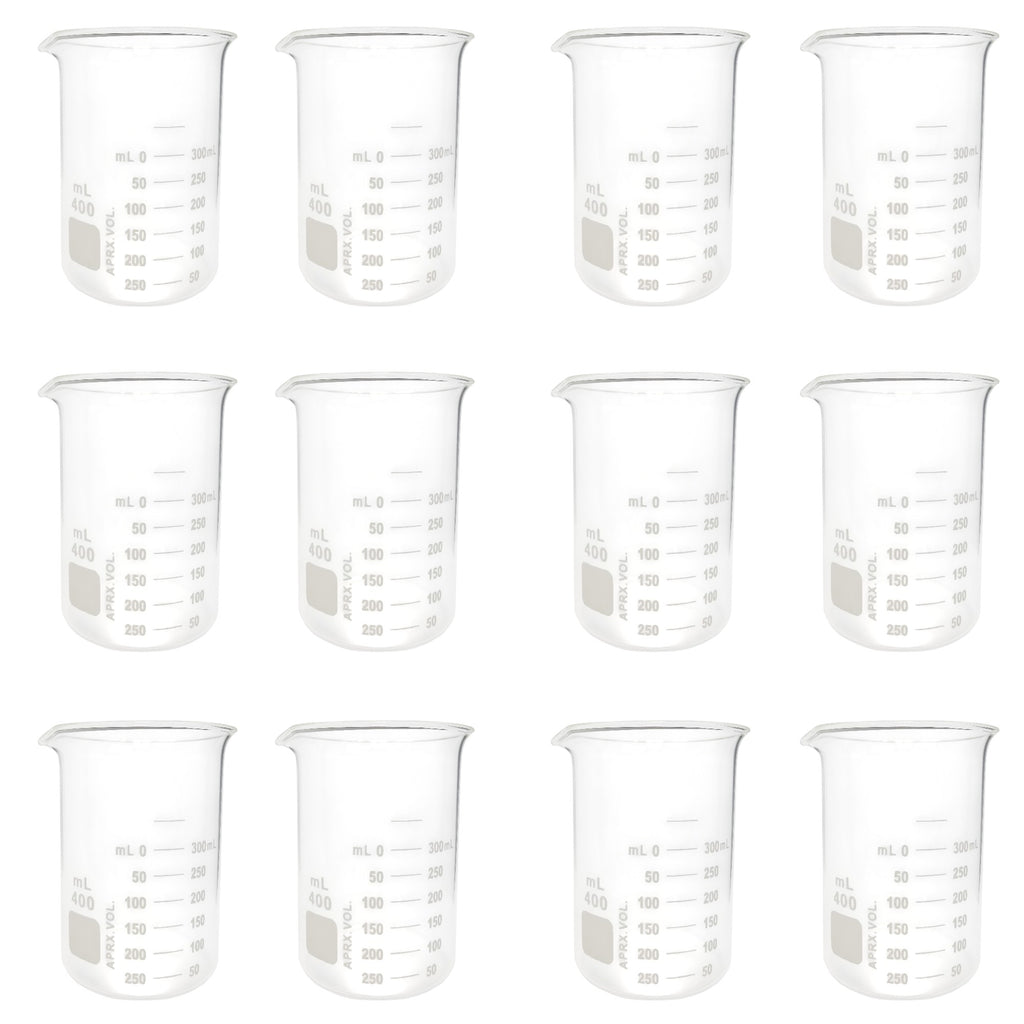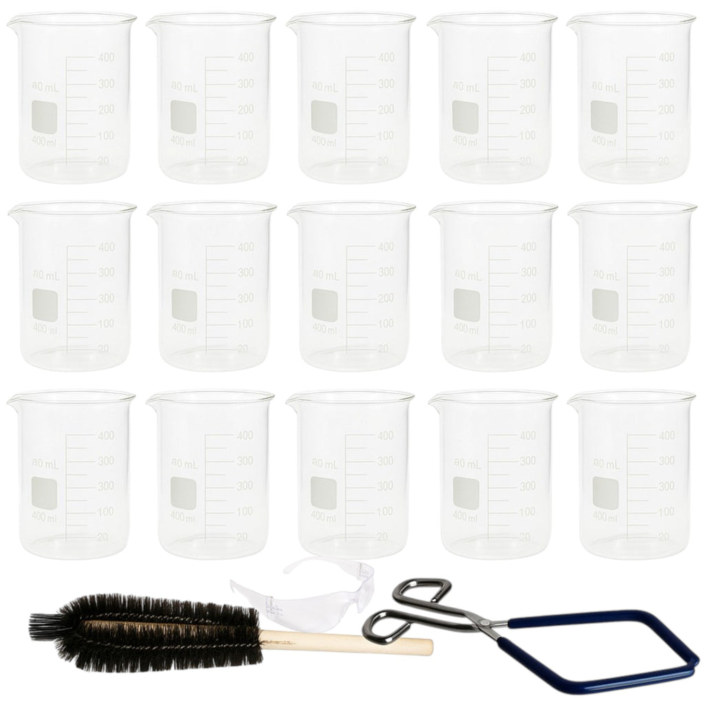 Lab Beaker Starter Kit – 12 - 400ml Griffin Style Beakers, Beaker Brush (330mm), Safety Glasses, Beaker Tongs with Plastisol-Coated Jaws – Essential Labware Bundle