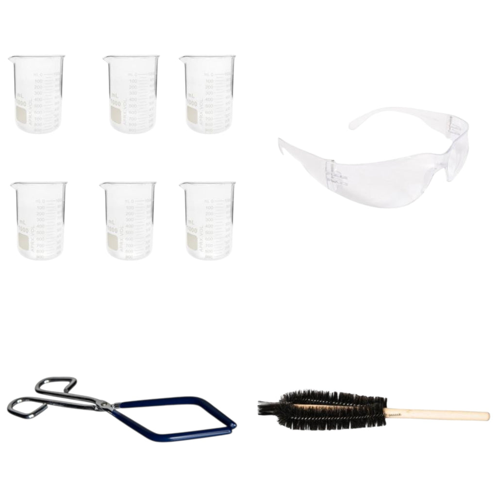 All-in-One Beaker Kit – Includes 6 1000ml Griffin-style beaker, 330mm cleaning brush, safety glasses, and plastisol-coated beaker tongs for convenient lab use.