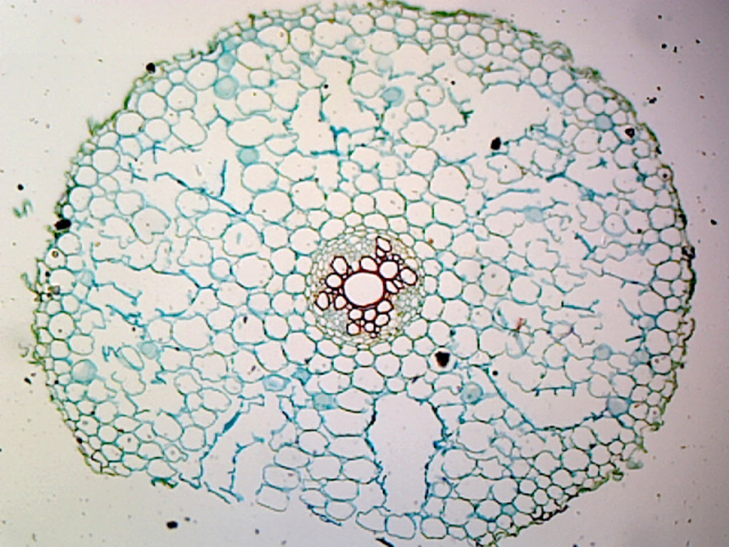 This slide is a cross section of a ranunculus root. The specimen shows vascular tissues, endodermis, and cortex. Typical herbaceous dicot root.
