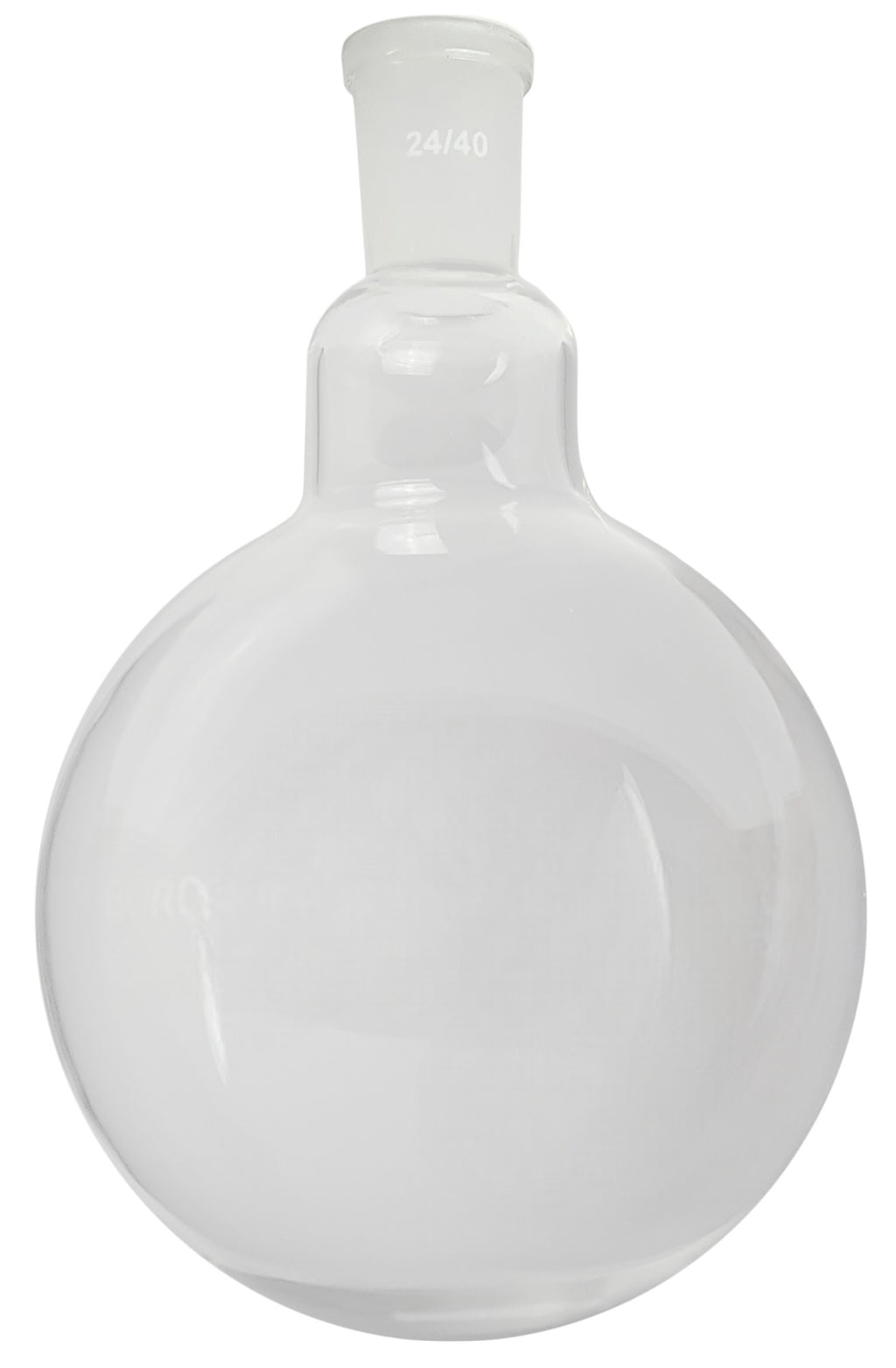 This quality round bottom boiling flask is made from borosilicate glass, and is heat resistant. It has a narrow mouth, a 24/40 ground glass top joint, thick walls, and a capacity of 1000ml.