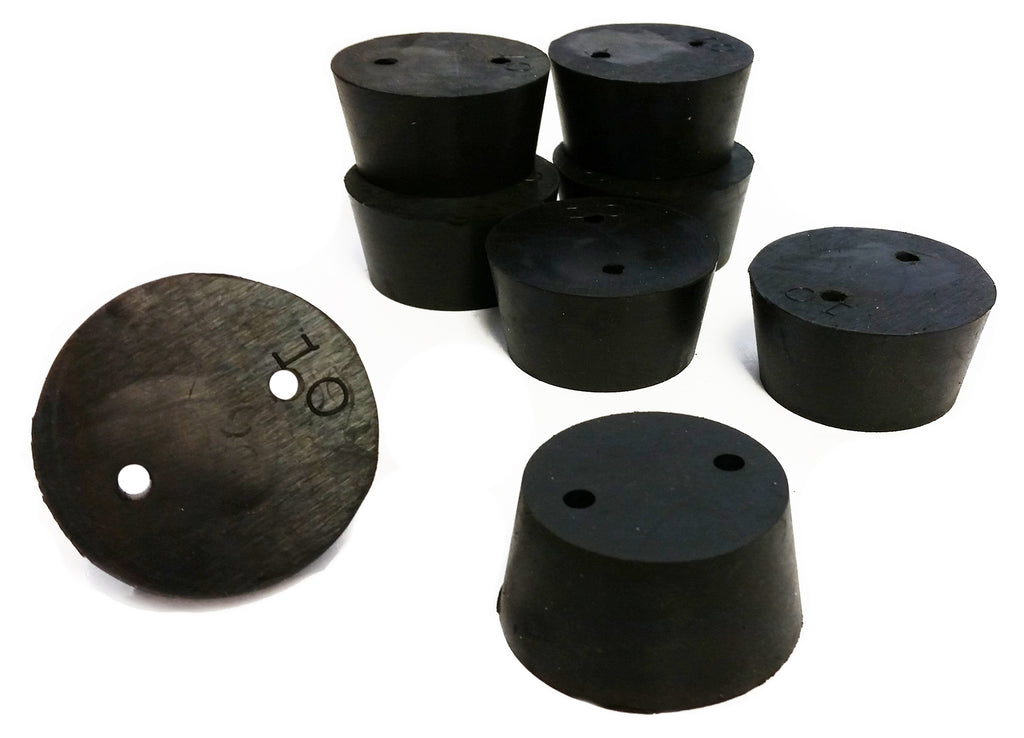 These stoppers are size __ and are drilled with two holes. Size 10 stoppers have top diameter of 50mm, a height of 25mm, and a bottom diameter of 42mm. Approximately 9 size 10 stoppers are included per one-pound pack.