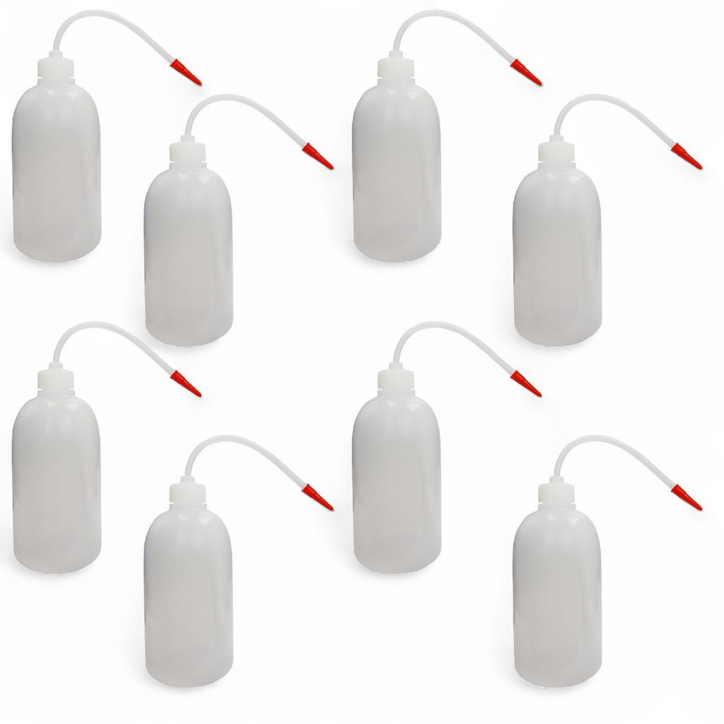 This squeeze bottle can hold up to 500ml of solution and is ungraduated. Its stem has a leak-proof seal to the cap and is flexible like a straw. Made from low-density polyethylene. Sold as a pack of 8.